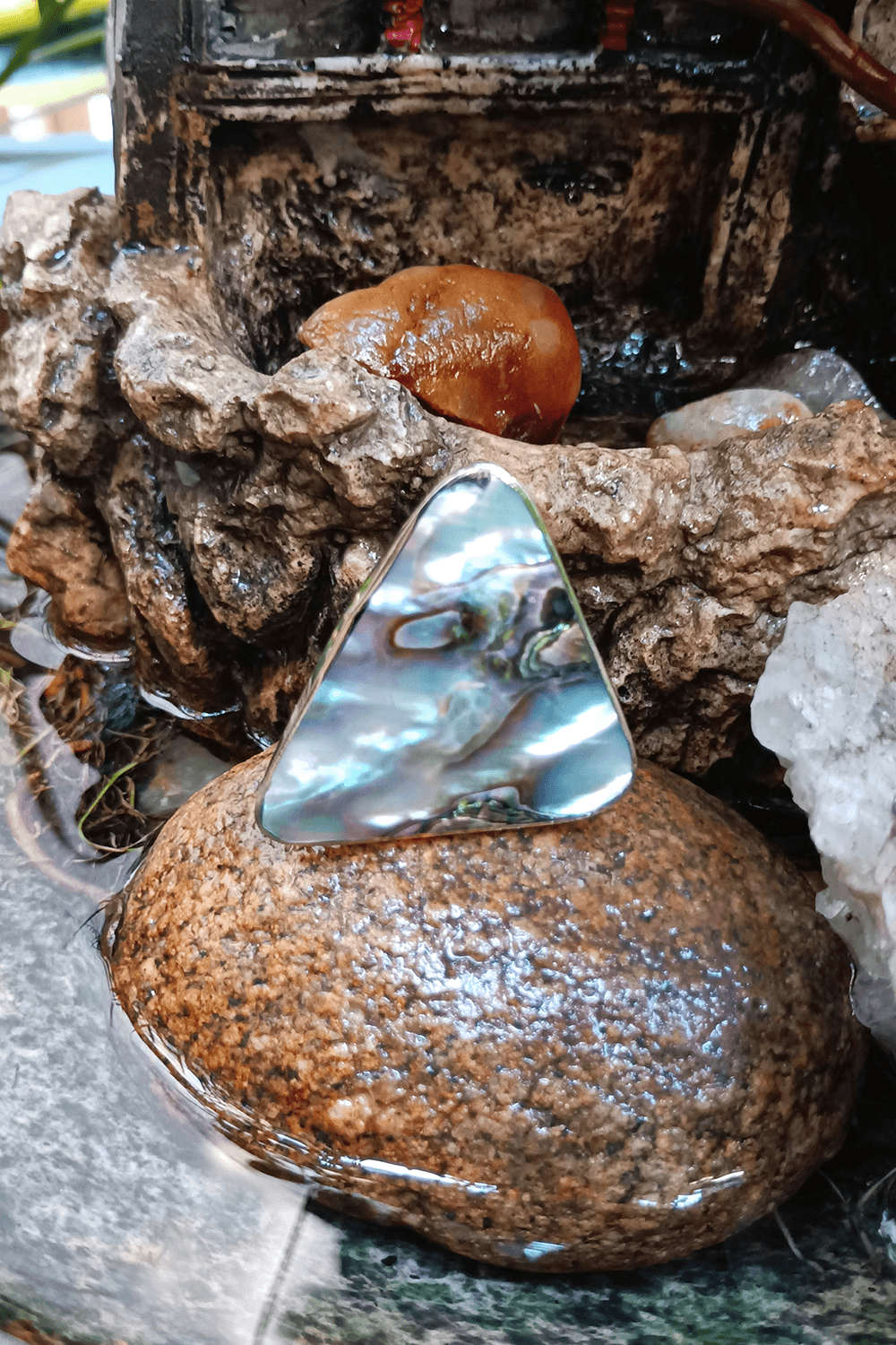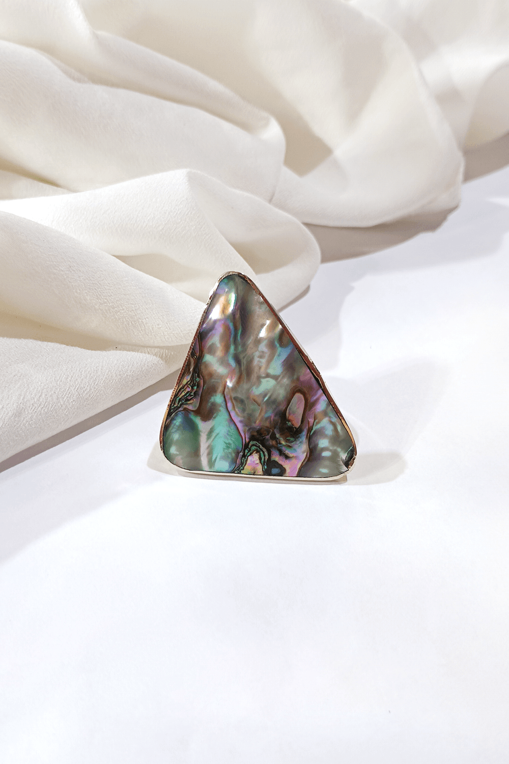 O formato assimétrico realça a beleza orgânica da concha, criando uma estética artística e contemporânea. A base em níquel oferece resistência, acabamento polido e leveza, valorizando ainda mais o contraste entre o metal e o visual vibrante do abalone.