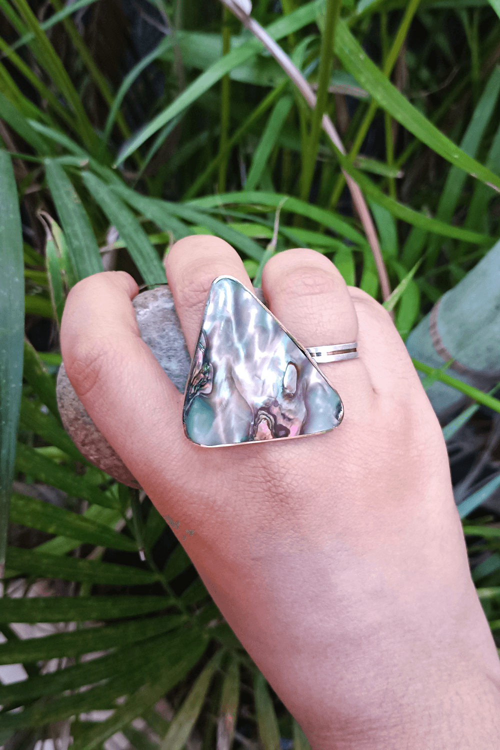 Este anel traz em destaque uma placa de abalone natural, conhecida por seu brilho iridescente que revela tons de verde, azul, púrpura e madrepérola conforme a luz se move sobre a superfície. Cada peça de abalone possui padrões únicos formados pela própria natureza, o que torna o anel exclusivo e cheio de personalidade.
