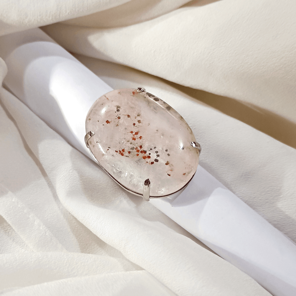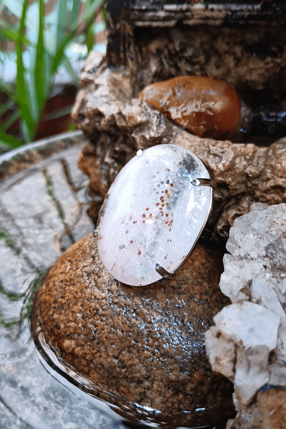 Anel Pedra Transparente com Inclusões Vermelhas – Peça exclusiva.