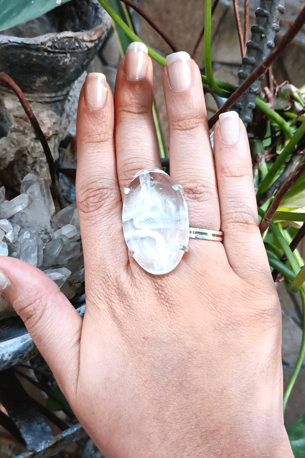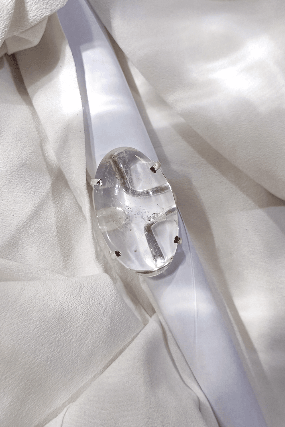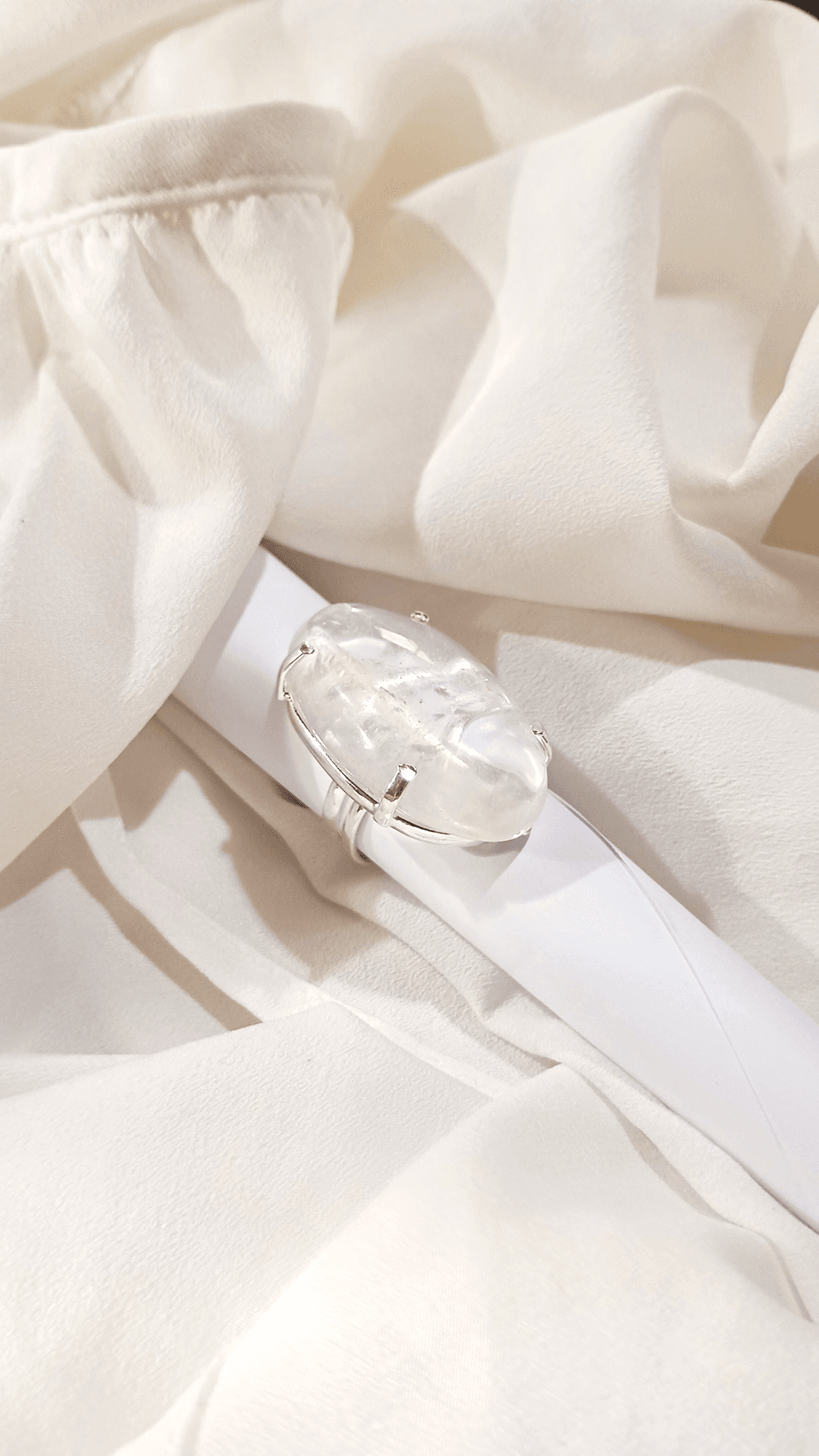 Este anel apresenta uma pedra oval transparente de grande destaque, com aspecto cristalino e brilho suave que reflete a luz de maneira delicada. O design limpo evidencia a beleza da peça, criando um visual moderno e minimalista, ideal para quem aprecia acessórios discretos, porém marcantes.