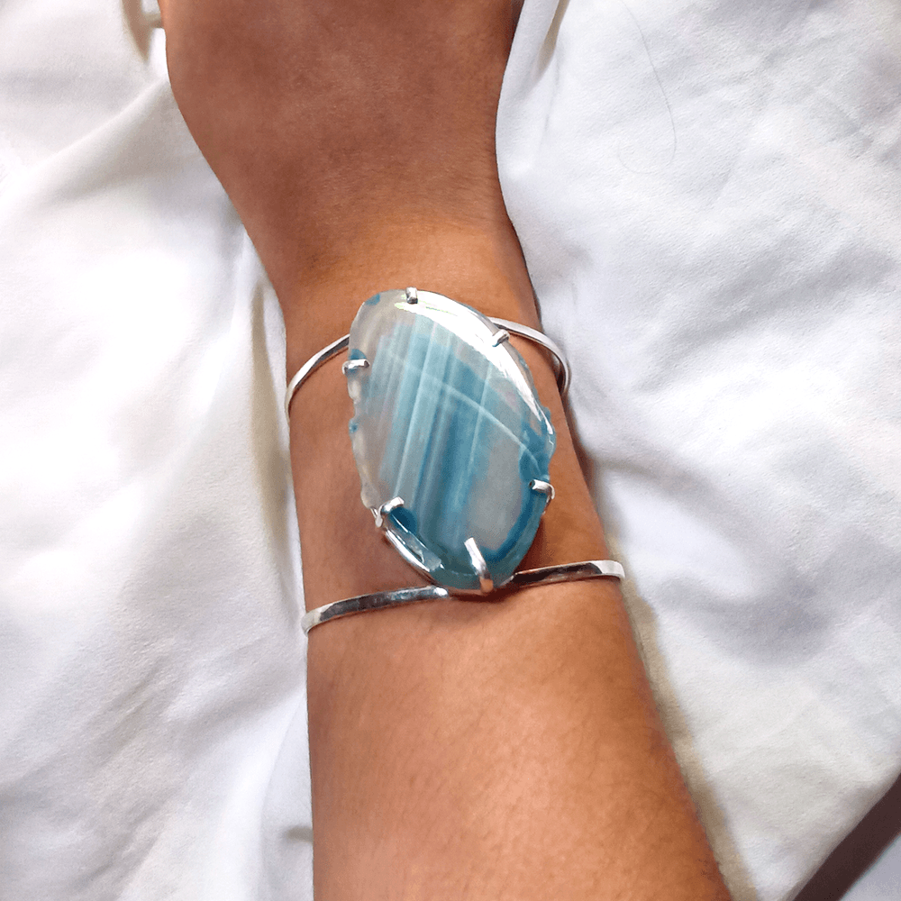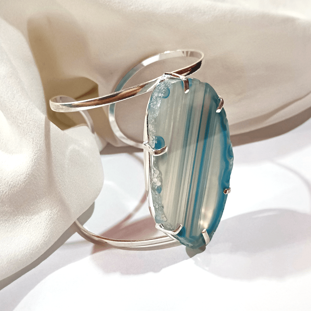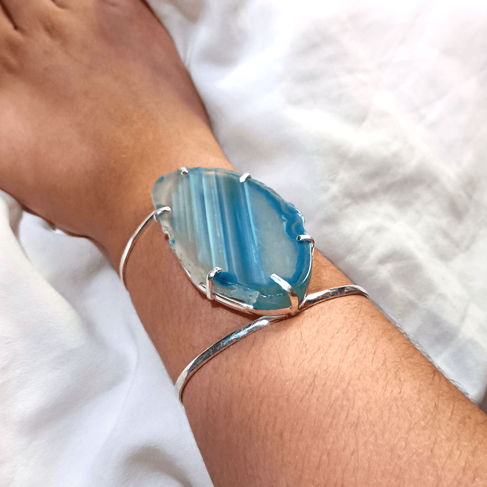 Bracelete pedra azul delicado e sofisticado, banhado a prata, com uma pedra rosa em corte orgânico que realça suas nuances únicas. A armação fina e elegante envolve a pedra de forma segura, criando um contraste suave entre o metal brilhante e o tom vibrante da peça. O design aberto permite ajuste confortável no pulso, tornando-o ideal para uso diário ou para compor produções mais refinadas. Uma peça marcante, feminina e cheia de personalidade, perfeita para quem aprecia acessórios artesanais com toque moderno.
