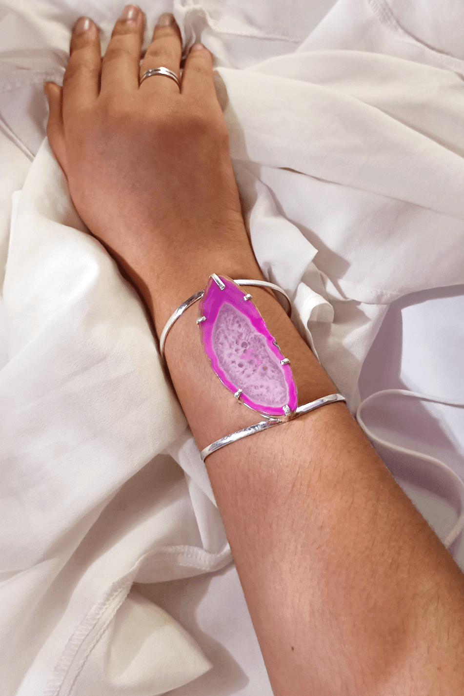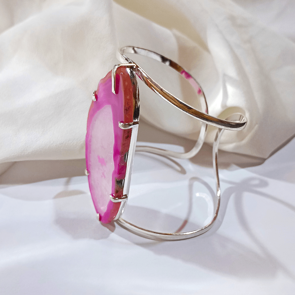 Bracelete pedra rosa delicado e sofisticado, banhado a prata, com uma pedra rosa em corte orgânico que realça suas nuances únicas. A armação fina e elegante envolve a pedra de forma segura, criando um contraste suave entre o metal brilhante e o tom vibrante da peça. O design aberto permite ajuste confortável no pulso, tornando-o ideal para uso diário ou para compor produções mais refinadas. Uma peça marcante, feminina e cheia de personalidade, perfeita para quem aprecia acessórios artesanais com toque moderno.