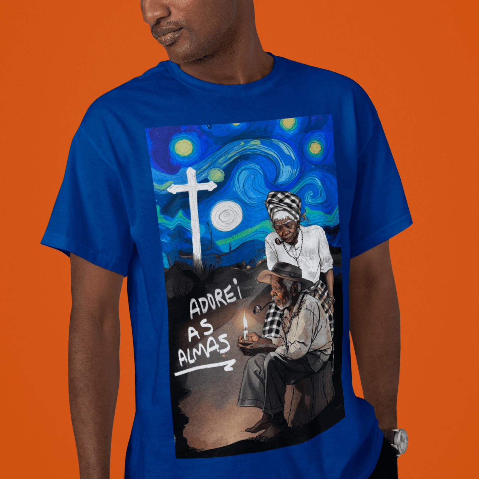 Nossa camiseta de malha é mais do que apenas uma peça de roupa; é uma reverência à presença e à sabedoria de Preto Velho. Cada blusa se torna um símbolo de conexão com as raízes e a espiritualidade, uma homenagem a aqueles que caminharam antes de nós e que continuam a nos guiar com seu amor e sua sabedoria.