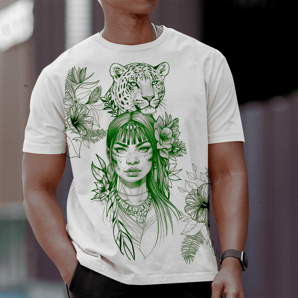 Expressando o sagrado através do estilo, nossa camiseta de malha 100% poliéster é uma homenagem à riqueza espiritual e cultural dos Caboclos, carregando consigo a sabedoria ancestral e a força curativa das florestas.