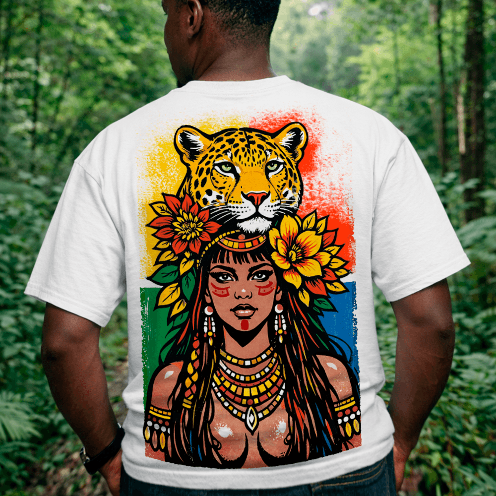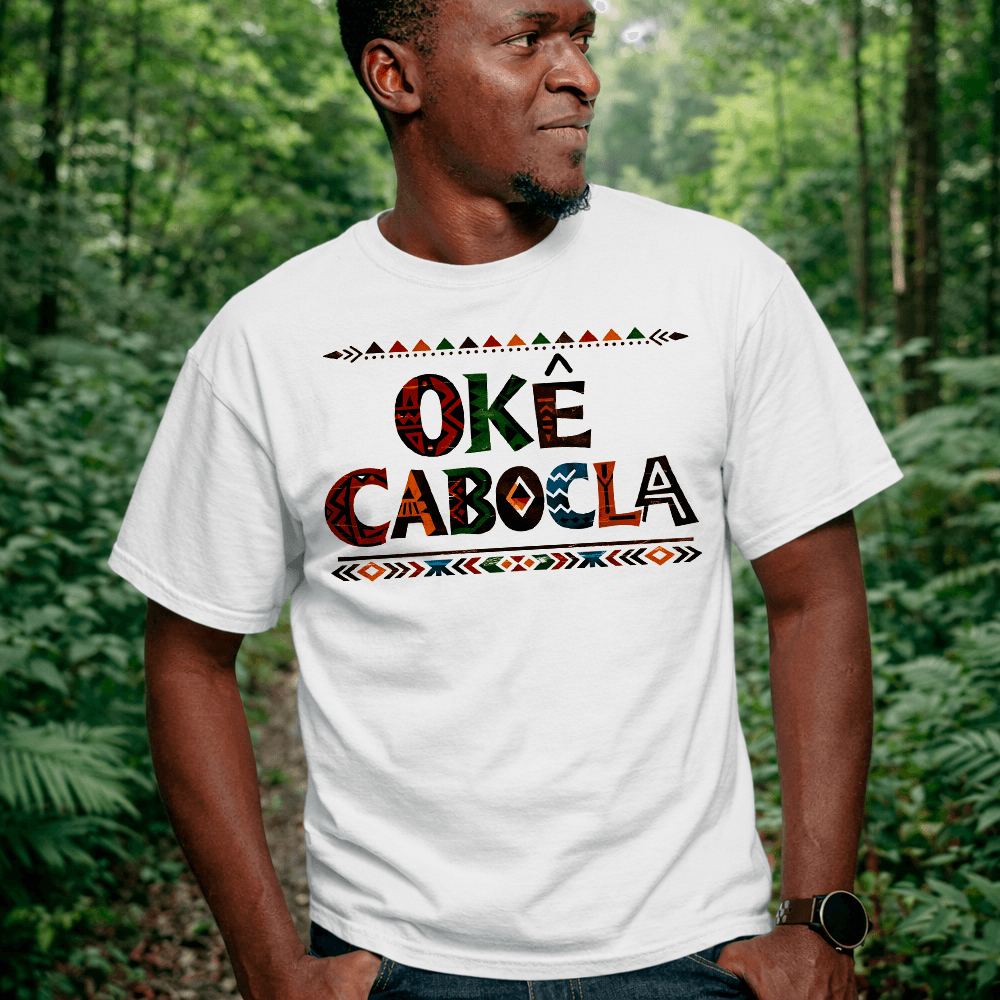 Expressando o sagrado através do estilo, nossa camiseta de malha 100% poliéster é uma homenagem à riqueza espiritual e cultural dos Caboclos, carregando consigo a sabedoria ancestral e a força curativa das florestas.