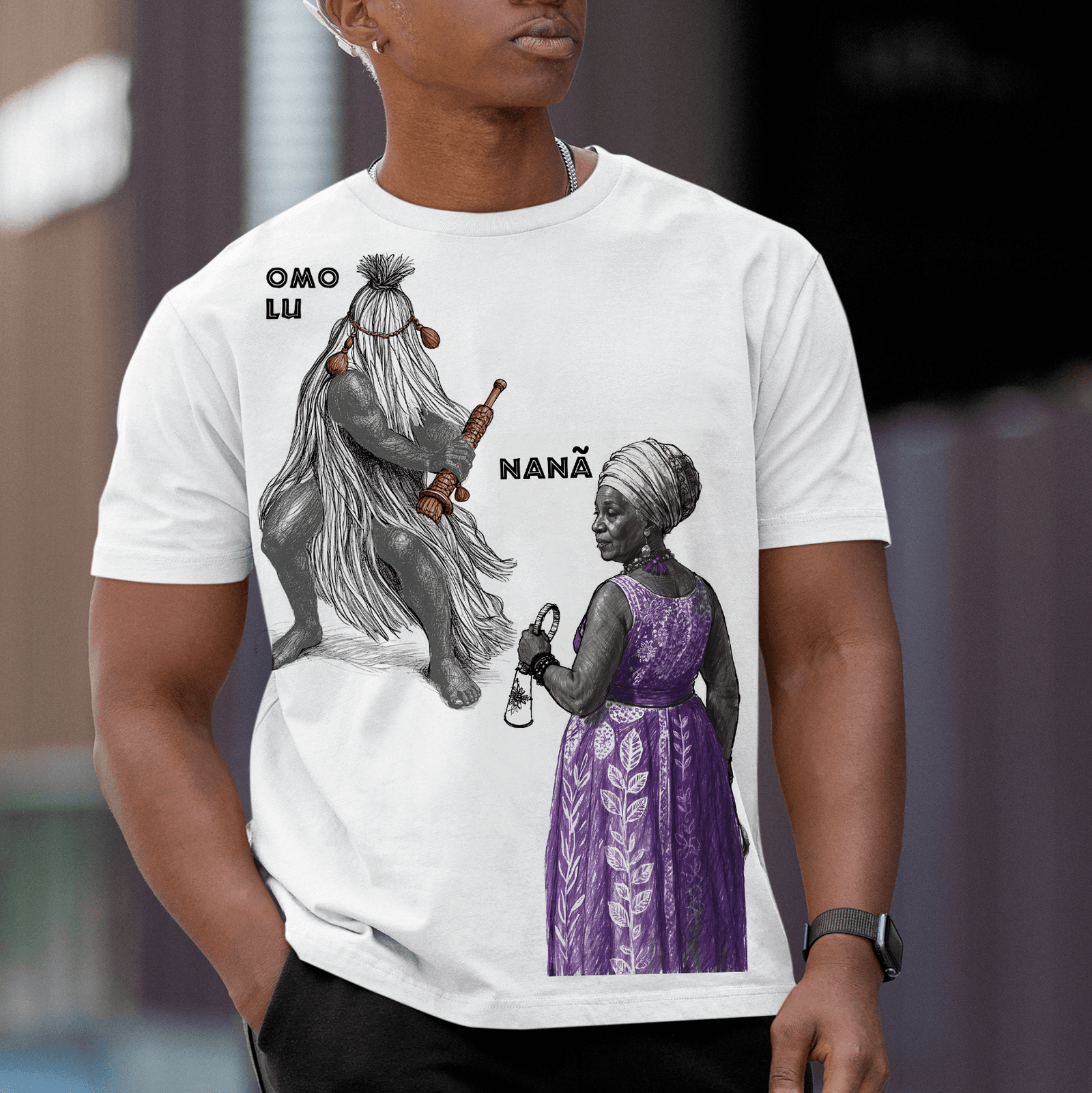 Nossa camiseta de malha 100% poliéster é um tributo a essa rica ancestralidade, indo além do seu papel como uma peça de vestuário. Cada camiseta é uma verdadeira homenagem à cura de Omolu e bravura de Nanã, trazendo em suas estampas vibrantes e detalhadas as histórias e a espiritualidade dos orixás. As cores intensas e os traços fortes que adornam as camisetas capturam a essência desses guias divinos, convidando todos os filhos de fé a vestirem a força e a sabedoria que carregam em seus corações.