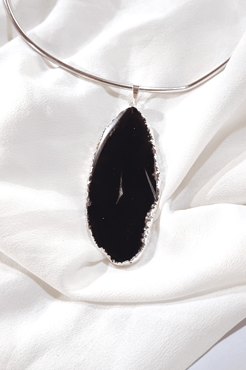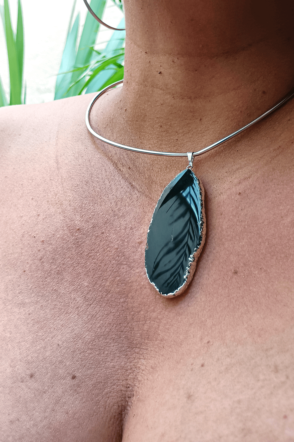 Este colar combina um aro leve e moderno em alumínio com um pingente de ágata banhado a níquel, criando uma peça que une estilo contemporâneo e beleza natural. A ágata exibe camadas orgânicas e tons terrosos profundos, trazendo um visual sofisticado e cheio de personalidade. Seu formato alongado valoriza o desenho da pedra e torna o colar um ponto de destaque em qualquer composição.